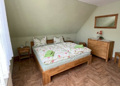 Das separate Schlafzimmer ist mit Ehebetten, einer Kommode und Kleiderschrank sowie Nachttischen ausgestattet. Nach einem interessanten und erholsamen Tag wünschen wir eine gute Nacht.  |